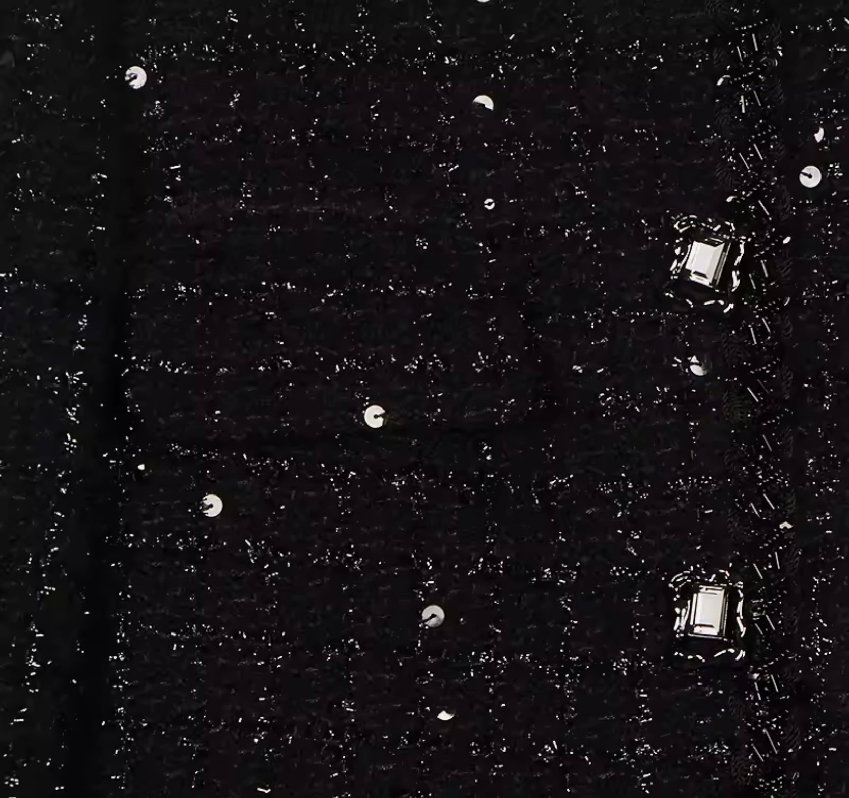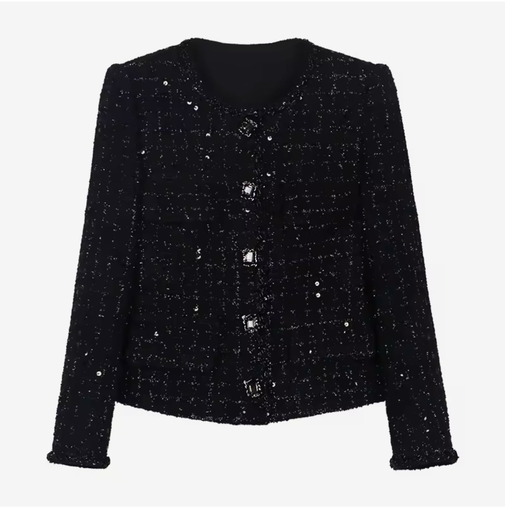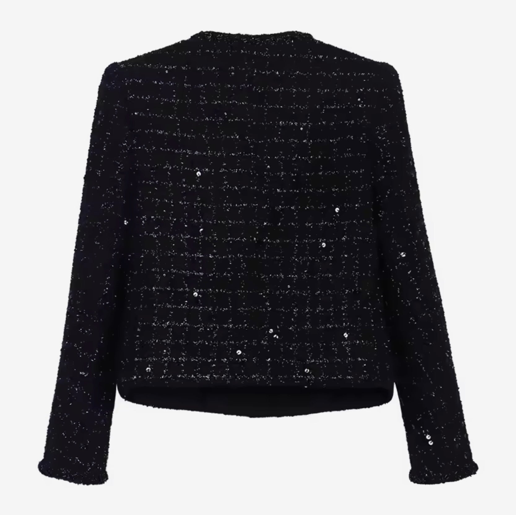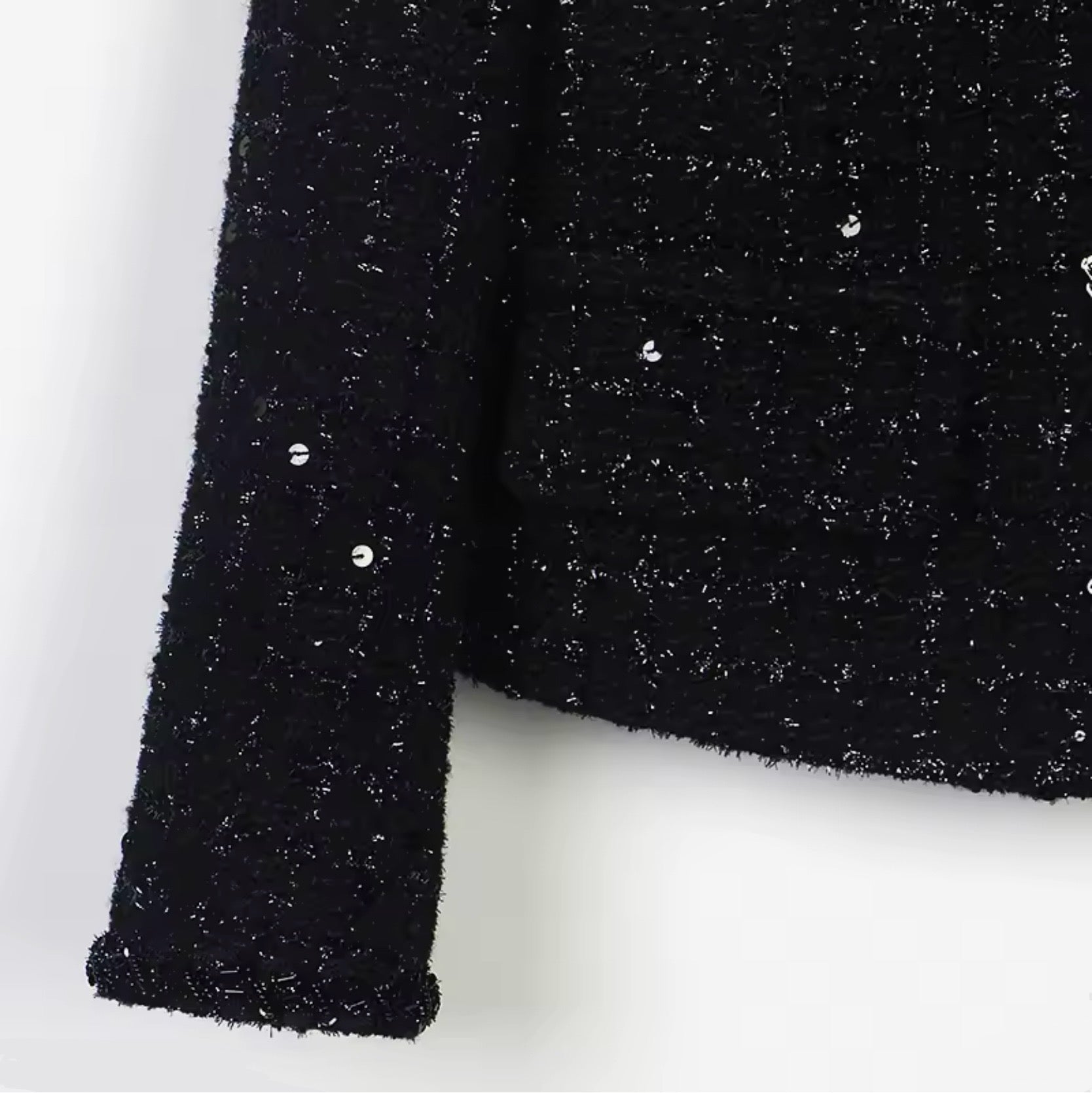 Discover timeless elegance with this celebrity-inspired black sequin tweed jacket.