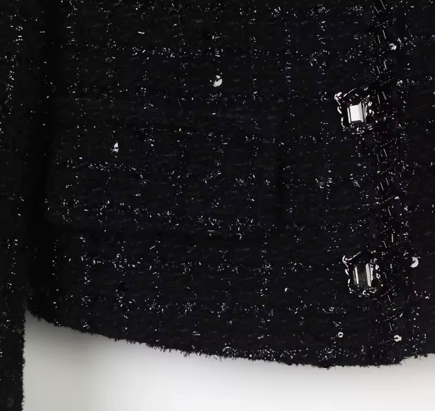 Elegant Black Sequin Tweed Jacket – Luxury Single-Breasted Blazer with Round Neck