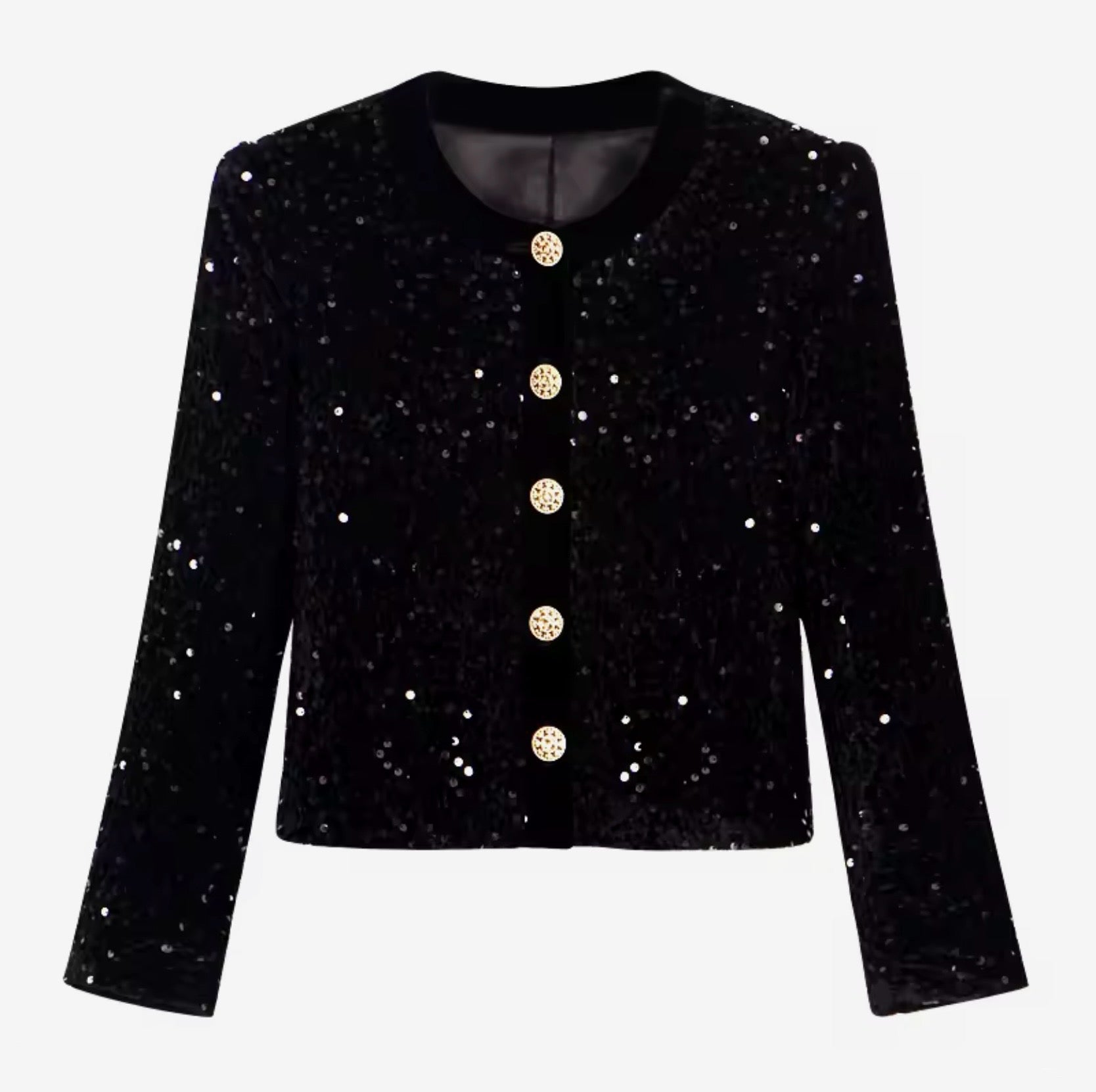 Luxury Black Sequin Tweed Jacket – Women’s Round Neck Single-Breasted Blazer with Gold Buttons | Elegant Celebrity-Inspired Fashion