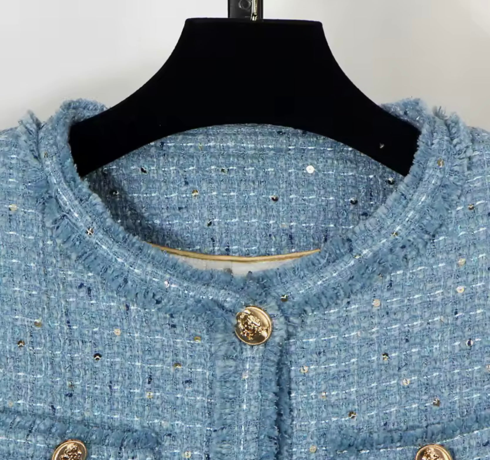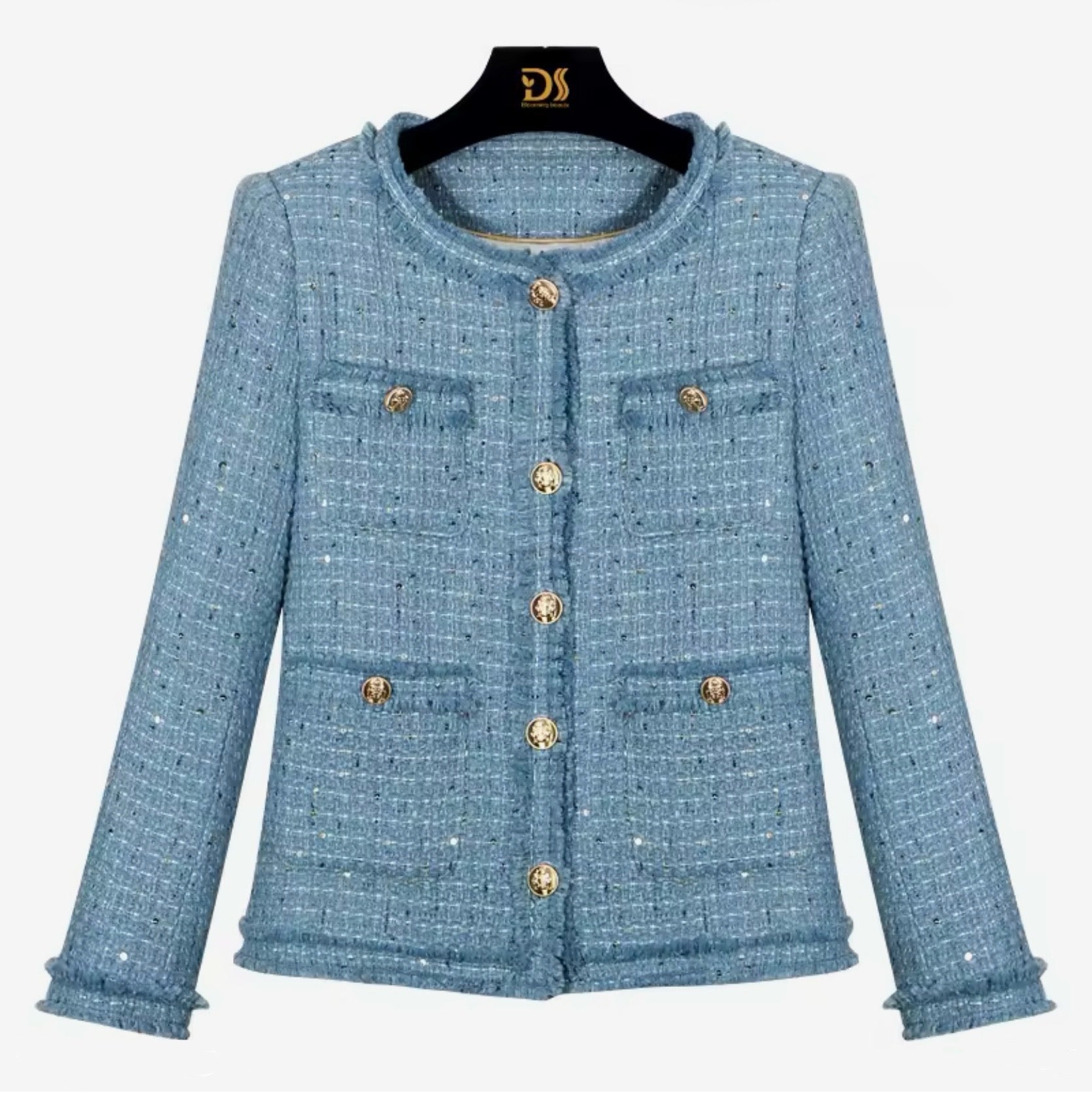 Whether you’re heading to a formal event, business meeting, evening dinner, or simply want a high-end street style, this blue sequin tweed blazer will instantly elevate your look. Inspired by celebrity-style fashion, it’s a versatile must-have piece for every stylish woman.