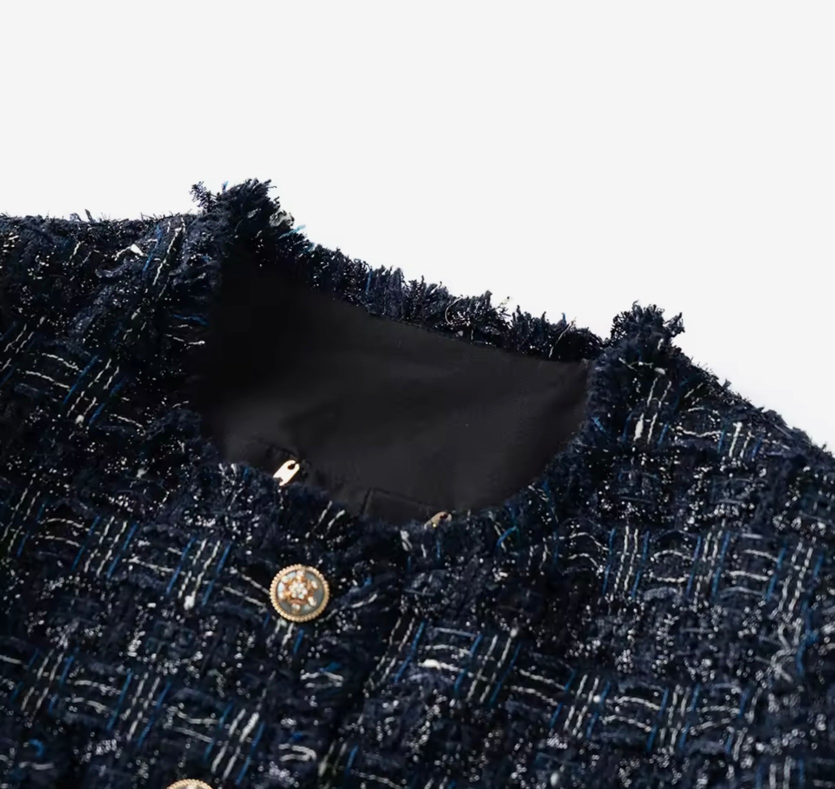 Step into sophistication with this luxury navy blue tweed jacket, a timeless piece inspired by celebrity style and high-end fashion. Crafted from premium tweed, this blazer features a classic round neckline, single-breasted design, and elegant gold buttons, making it a perfect mix of tradition and modern chic.