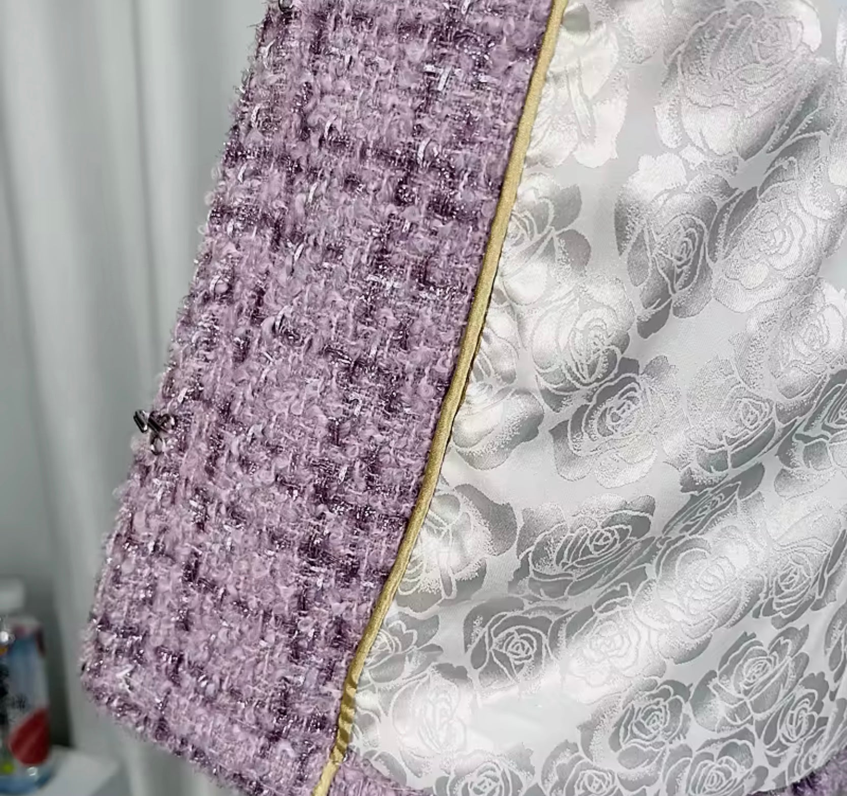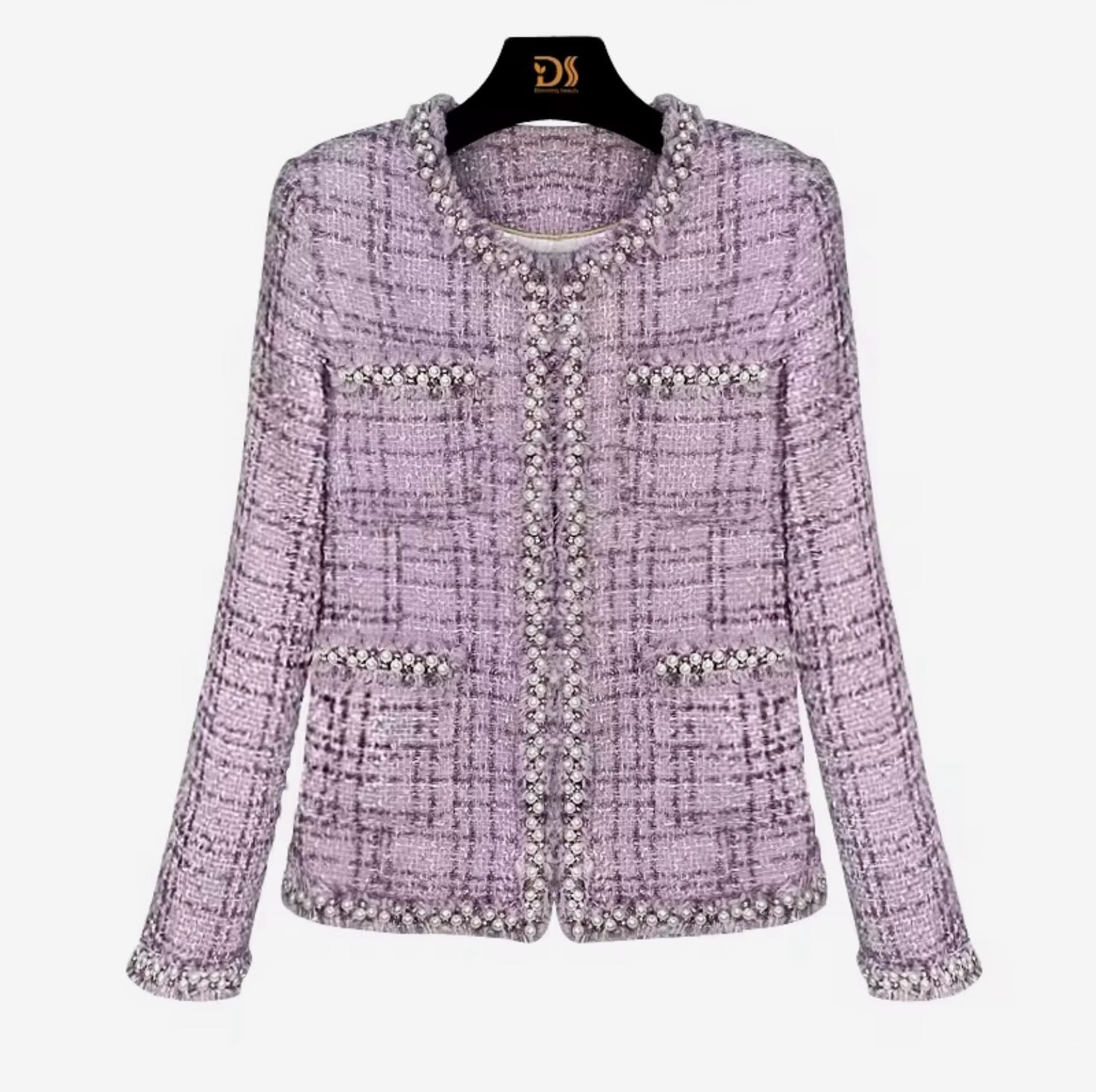 Add a touch of timeless elegance to your wardrobe with this luxury purple tweed jacket, designed with exquisite craftsmanship and modern sophistication. Featuring a round neckline decorated with pearl beaded trim, this blazer perfectly balances classic charm with high-end glamour.