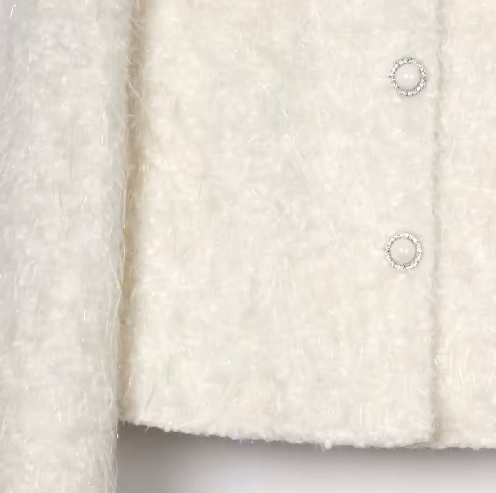The premium tweed fabric paired with decorative crystal buttons makes this piece a versatile choice for both formal events and chic everyday looks. Whether styled with skirts, trousers, or jeans, it delivers effortless elegance and a polished silhouette.