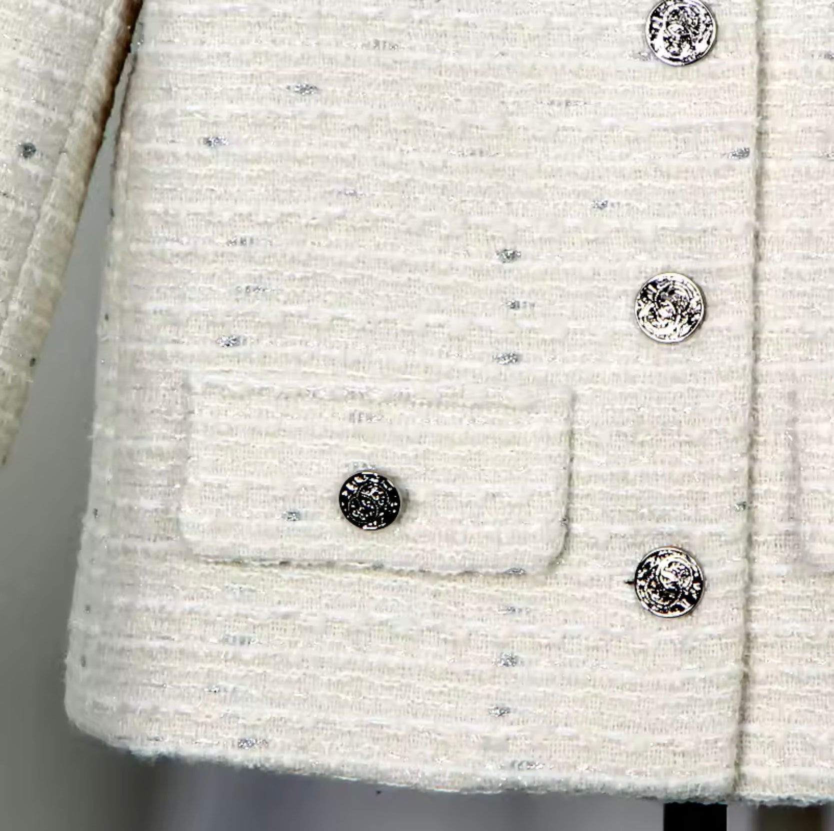 Step into timeless elegance with this luxury white tweed jacket, designed for women who appreciate sophistication and high-end fashion. Featuring a classic round neckline, single-breasted closure, and crystal-embellished buttons, this blazer delivers a polished and refined look inspired by celebrity style.